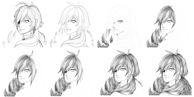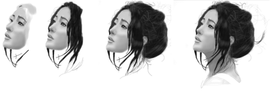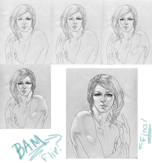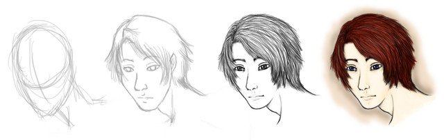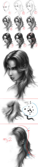 2. after you're finished with that, you can start shading any areas you want to start at. me, i start here, then stopped and went somewhere else. its happens a lot. anyway, there's a specific way i shade the hair in my portraits. when i shade, in order to make it look like hair, i always use varying strokes, going one way. this causes unevenness, which in the hair, we want. if you take a look at the pic, you'll see what i mean. then go back and darken the shadows if you so desire. next, add any stray hairs you see to the outer part of the hair. use a .5 lead pencil for this, unless you have a very light touch. when drawing individual hairs, i usually find that stroking from the inside(towards the head), outward causes a very natural looking affect for hair, because the human hand is naturally heavier in the beginning of the stroke, then lightens up slightly towards the end. anyway, in this picture, all the hairs were blurred, so to do that just use a blending tool of some sort to run back over them when you're done