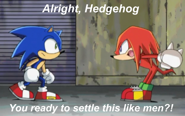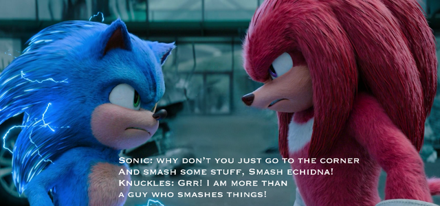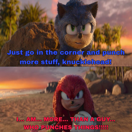 Sonic and Knuckles are arguing, but it's a familiar argument. What is it from? Hint: Based on a recent animated film that's a lot of fun to watch.Sonic the Hedgehog belongs to SEGA and Sonic Team.
