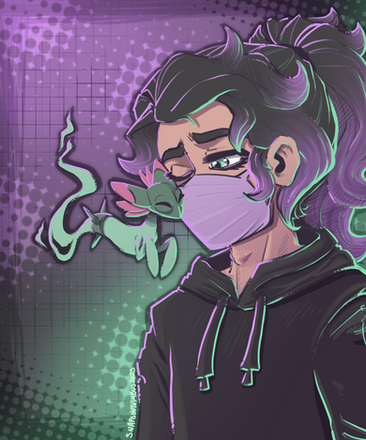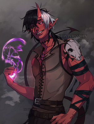 This is a birthday gift for my friend, Kelsie! This is her dnd oc, Varian, and he's the edgy demon boy.I had so much fun with this. It's been so long since I drew a hunky, shirtless man.