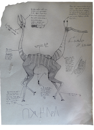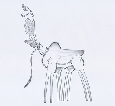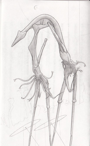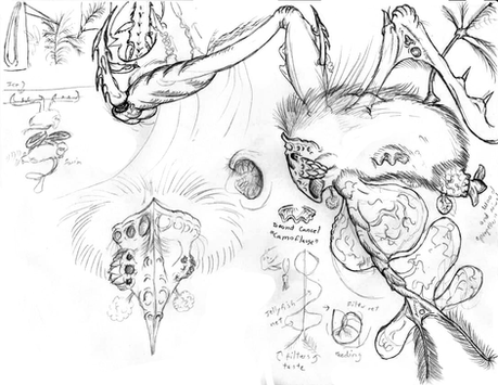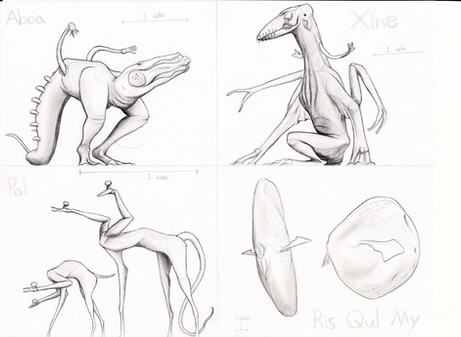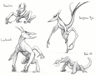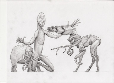 Hello there. (smile) These three critters here are aliens requested by OJ. Hope you like them!(Left) Szjur'szjema: The Szjur'szjema are a race of tripedal omnivores native to the tropical moon, Huvo, of the gas giant Gi'zjar. They evolved in the dense jungles on the near side of the moon, making the nights very bright. They are nocturnal and have developed a sophisticated camouflage based on tiny photo-optic hairs that cover their bodies. These hairs can change colors in multiple layers, allowing the Szjur'szjema to practically disappear at night. The mouth is located at the base of the neck, above the forelimb, and a row of tentacles runs along either side of the neck, including four retractable tongues at the base. This is how Szjur'szjema handle food and tech. Their large eyes are highly sensitive in the dark, and their vision extends slightly into the infrared spectrum. They possess very distinct sexual dimorphism. Females are the larger ground dwellers, while the males are small, flat gliders. After elaborate courtship rituals, a bonded male and female will fuse together, the male providing constant sperm and more senses to the ambulatory females. Males are non intelligent and there exist many breeds of fashion and utility males today. Szjur'szjema societies are organized much like human ones in most general aspects.