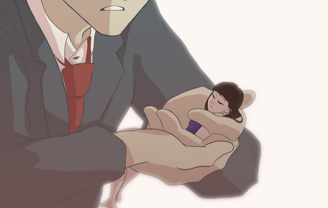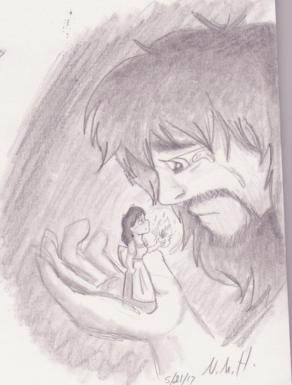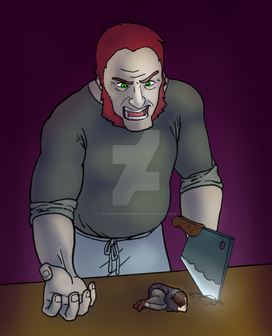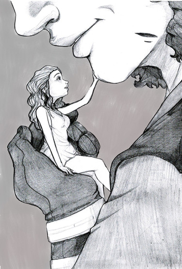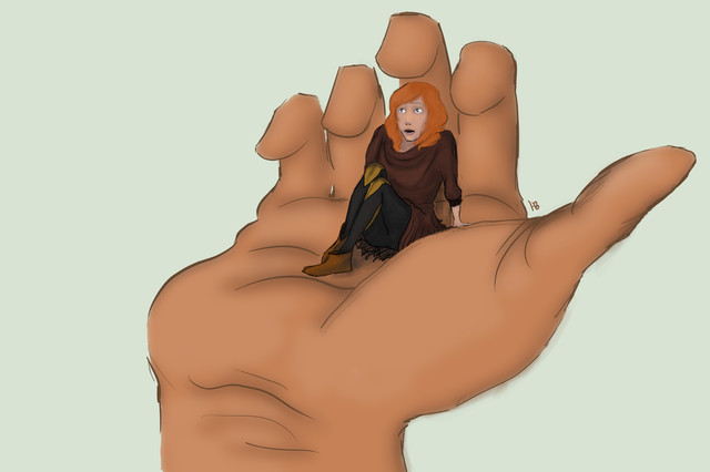 ...Large gloved fingers encased her little body, plucking her tiny form effortlessly from the ground and cupped her into a warm palm that brought her up higher and higher. The same large fingers curled around around her slightly. A giant face loomed ahead, lips parting in a grin, and flashing his terrible teeth. Green eyes as sharp as knives cut into her as she stared back, her bottom lip quivering as she whimpered in fear.