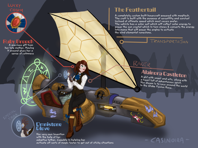Introducing my Radical Racer for the DeviantArt Original Character Challenge!Mirani Mezelk hails from the sandy province of Arom. For reasons unknown to her since childhood, she and her family have been living in exile alongside the Branded, individuals who have lost imperial citizenship due to unforgivable crimes. Living among all sorts of tough folk, Mirani had to learn how to fend for herself. She lives and fights in the company of her Divine Beast, a Racax she named Vento. After Mirani's mother was held hostage by the Don, the mobster who murdered her brother, Mirani and Vento worked within the underground in the hopes of saving the only family she had left.