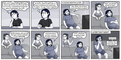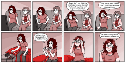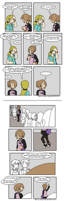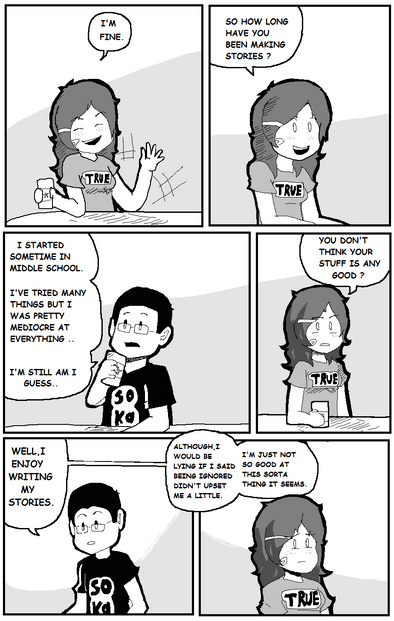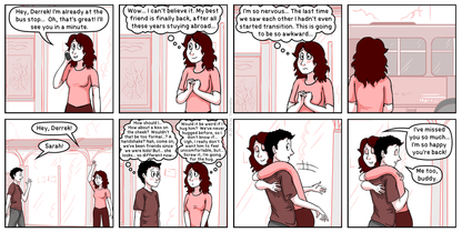 Here we are introduced to Sarah's parents, her little brother, and also to her ex-girlfriend Emily. My family is bigger and more complicated, divorced parents, and half siblings on both sides. For the comic I decided to keep it a bit simpler though.