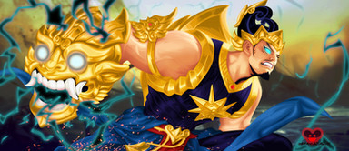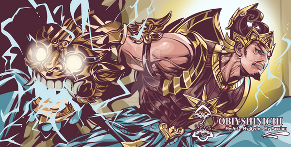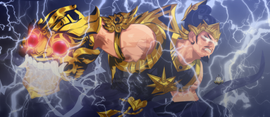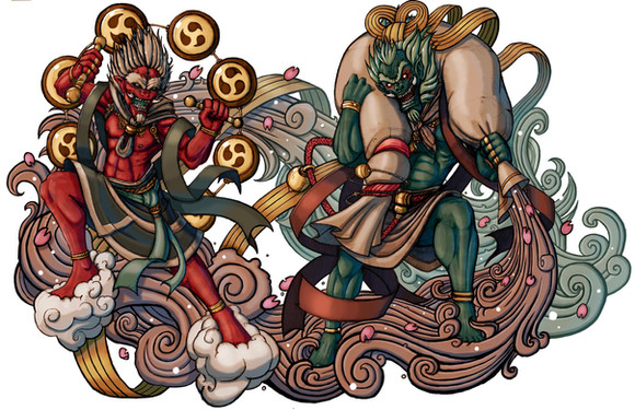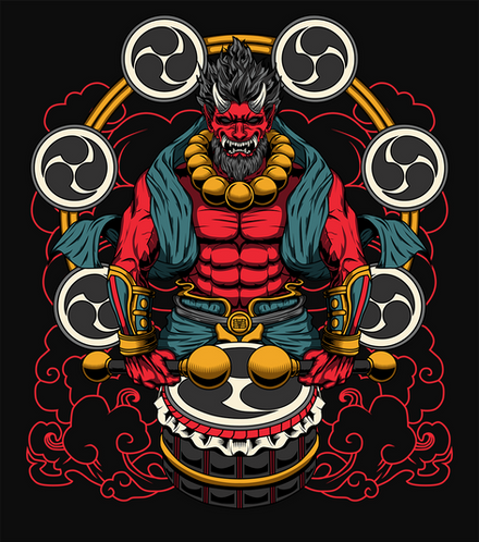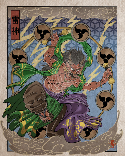 Zeus is the King of the Gods, the ruler of Mount Olympus and the god of the sky and thunder in Greek mythology. His symbols are the thunderbolt, eagle, bull, and oak. In addition to his Indo-European inheritance, the classical "cloud-gatherer" also derives certain iconographic traits from the cultures of the Ancient Near East, such as the scepter.Raijin is a god of thunder and lightning in Japanese mythology. His name is derived from the Japanese words rai (meaning thunder) and shin (god). He is typically depicted as a demon beating drums to create thunder, usually with the symbol tomoe drawn on the drums.