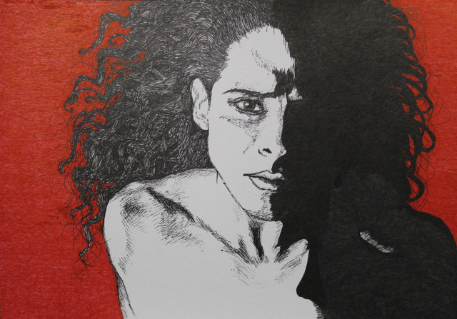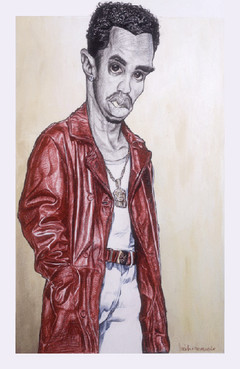 I don't remember why iI titled this weirdo soo long ago, but that is the name. This is actually a piece done in color on colored ill. board. I don't have a color version of it though.. Igoota find the slide and rescan it. The colors are pretty (for my stuff) Lavebdr and pinks I believe..This is siitn in my Mom's basement along with most of the drawings in my scrap from before 2000.A life drawing 18"x24" or bigger....
