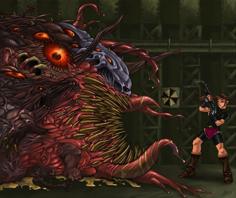 i remember this scene...altough i havn't played it in a few months..i could just imagen the fear claire/leon gained after looking up and seeing one of these..but yeah this is great artwork...