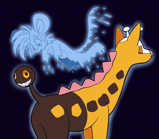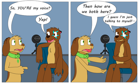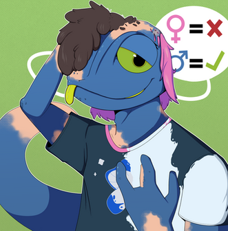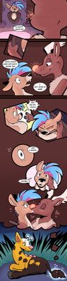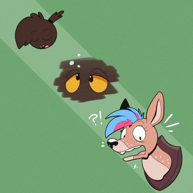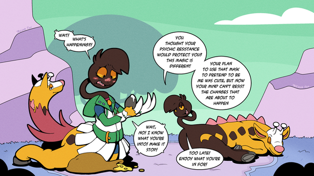 #comic #birdo #deer #dialogue #female #male #text #transformation #yoshi #nonbinary #blue_background #brown_fur #speech_bubble #black_body #living_tail #trevor_fox #tail_head #spotted_fur #orange_sclera #purple_body #sudden_transformation