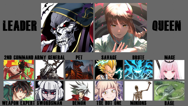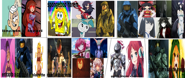 top:master chief,general grievous,ainz ooal gown,spongebob,didact,adam,guy,nu 13,shrek and iruma suzukibottom:bell cranel,da vinci,fulgore,spiderman,maple,kirito,zeratul,mamako oosuki,church and caboose