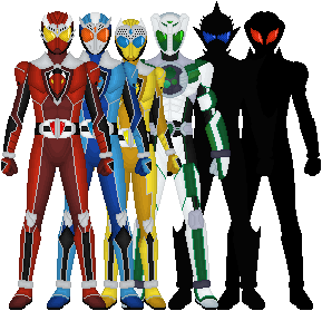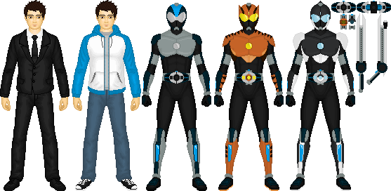 Kamen Rider Arsenal / Aaron Miller (no relation to Cryo) is a Kamen Rider based on weaponry. His orange and blue base form is called BladeGunner and is achieved using the Blade and Gunner Weapon Keys. His two alternate forms are the red and yellow SpeaRugi (spear and tsurugi sword) and the teal and purple SniPistol (Sniper rifle and pistol). His green and silver super form is AxeBlaster and can be swapped around for different combos like the other three (although Aaron cannot withstand this form for too long without taking damage to his system). His final form is the golden Armory form.