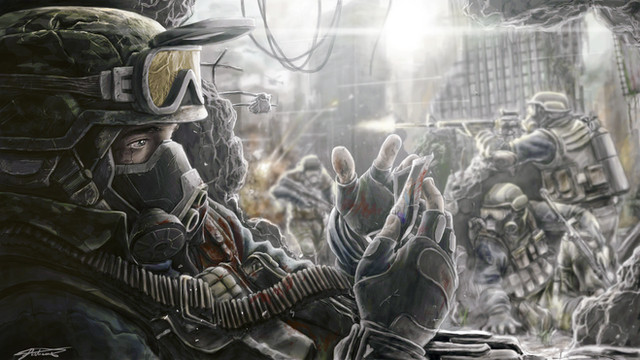 Calling the soldier "layer" would be wrong since he consists of many layers - body, balaclava, helmet, goggles, goggle effect, helmet camera, patch, text and so on. Add light modifications, texture replacements and adjustment layers and it's pretty much up there along 50 layers. I could merge them, but then again I like to be able to move things later on if I change my mind.