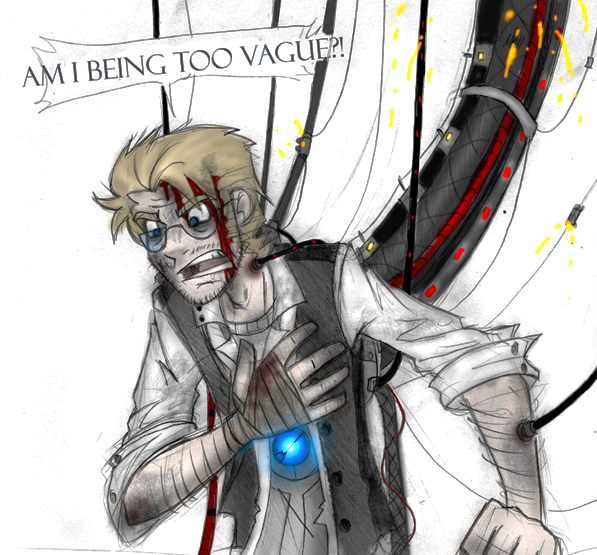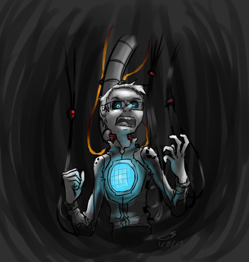 Wow. This is a great picture. I can imagine the scene for it. Wheatley is trying to hold it together after realizing what he is doing and saying to Chell; he's trying to stop himself from putting her through more torment because of him. Unfortunately, as the game goes, he's not successful. The only thing I'd like to see added to this picture would be blood trickling down his fingers and dropping on the table from his fingernails digging into his skull from Wheatley going out of his mind. It'd make the picture much more dramatic.