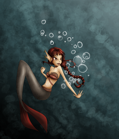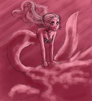 The shading on her shoulder should be a smooth descent down her arm, instead of gathering right underneath the deltoid like that. The light shouldn't be casting a shadow like that unless she's ripped. >_< But I love her wide-eyed, curious look, and the lighting in the water behind her promises to be gorgeous!