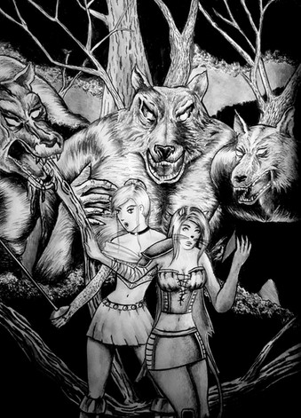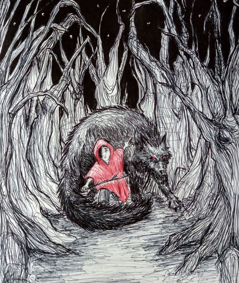 you did wonderful sketch!!! very creative with the wolf usually we him walking beside her or behind her spying on her , this is different and creative