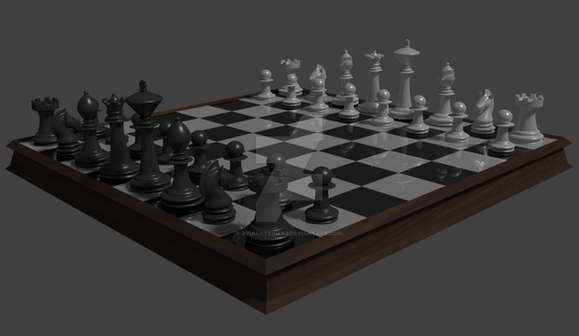 [EDIT:] Just in case you´re wondering: The black parts in the glassfigures... Well, at first, i thought it was a rendering error, because my rayTracing was set too low or something, but in fact its correct that way: The glass figures (as well as the black ones) DO all have a small black SOCKET to stand on, which is a little bit "inside" the figure. I thought, that would make sense, because you wouldnt want the figures to scratch over the surface of the field, right? And if youre thinking, the chessboard was hovering in the air a little: youre right. The Board has four small feet it stands on, so it wouldnt get scratches when you put it on the table. [/EDIT]