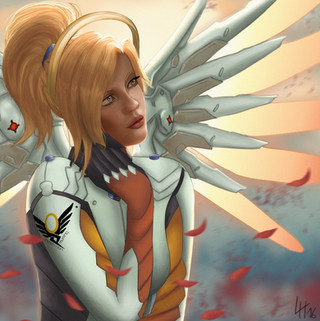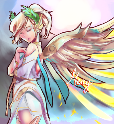 This is such a beautiful piece of Mercy! Everything is drawn so well, and the lighting and shading in this piece is amazing! I love how you drew this skin, and all the little details are so well done. The colors and pose are perfect, and my favorite part of this piece has to be Mercy's face! It's just so well-drawn, and the popping blue eye color is fantastic. This is one for the Favorites!