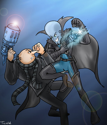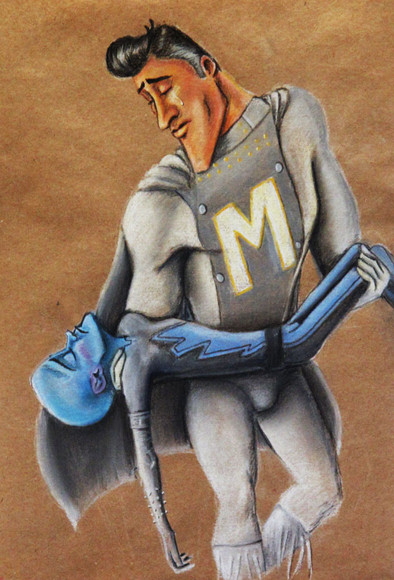 This is awesome, I've seen a lot of pictures like this of them only with the role reversed but it's kinda of nice to see Metz sunken to the ground all dramatic like for a change. And poor little Megamind's expression! He looks so concerned, it kills me lol.