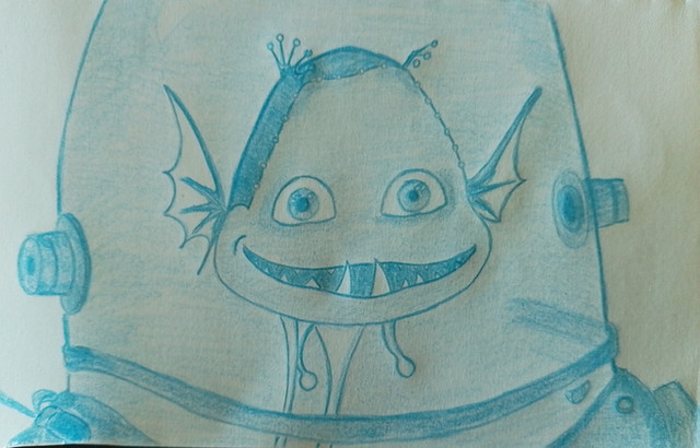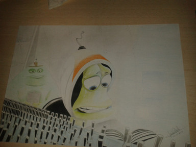 This one is pencil crayon on blue/grey paper. I like how the drawing turned out, but I'm unsure of the paper. I actually bought it to draw our blue villain, but ended up drawing Minion instead. *shrug*Of course the most difficult thing to draw was that stupid valve thing! Me no draw circles or elipses durrr