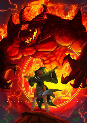 This is an amazingly thoughtful, intelligent depiction of Ifrit. I love the dimensions and activity of the whole image. I could feel the flames curling around as well as feel the surety of safety, knowing the summoner was capable. I love the detailing done. It shows that you put in much time, effort and care into this image.