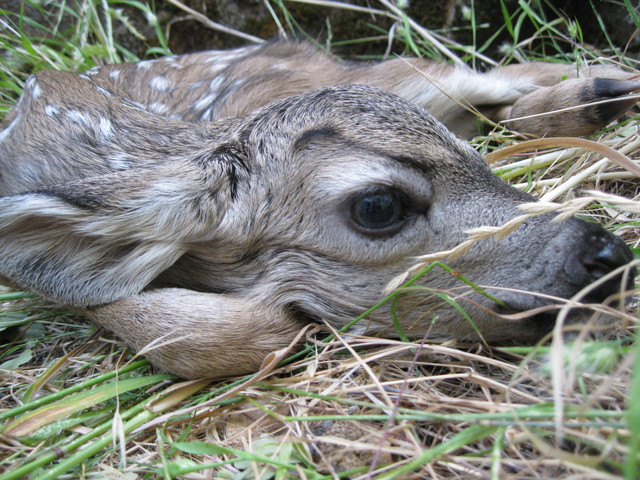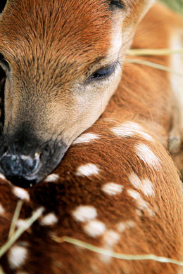 Newborn Bactrian red deer.First few days red deer babies don't stay together with their moms. They lay silently in grass side away from everyone. You even can get near it and touch it, baby won't be running away.