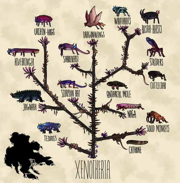 Nebulous Strider: By far the largest of the striders, and one of the largest xenotherians period, this towering jungle browser stands nearly as tall as a giraffe and up to two-thousand pounds in weight. Their great height is accompanied by the reach of their prehensile tentacles, which can reach an additional six feet above them, allowing them to reach high into the canopy to feed on photosynthetic lobes and fruit-eggs far above what any other pseudo-herbivores can reach. Much of its upper body is filled with air sacs that help to oxygenate blood to the head and keep itself easily balanced by reducing its body weight. Healthy, full-grown nebulous striders are one of the few animals on the corpse-isle which are virtually immune to predation; not even the dreaded sabrebeast, a hunter that specializes on striders, normally feeds on the adults. Not merely is it their size which protects them, but the closeness of their social behaviour; adult females and their young travel together in herds, maintaining contact with subsonic booming and establishing social bonds by repeated cooperative grooming, and will help defend one another and each others' offspring when threatened. The slightly larger males travel alone in bachelor groups, usually siblings, but sibling groups may occasionally accept lone strangers. These are one of the most popularly known of R'lyeh's megafauna in part due to their frequently docile nature, speculated to be due to them mistaking humans for juvenile striders, which induces parental instincts.