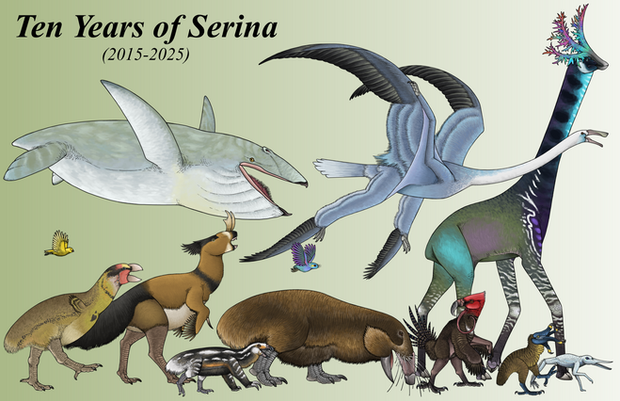 King Strider: Strange and lonesome wanderers of the alpine slopes, these golden xenotherians finds comfort not amongst its own kind but mingling within the herds of other montane dwellers, grazers such as the retchgoats and moon apes. This is a mutually beneficial relationship, as the great height of the six or seven-foot tall strider allows it to scan far and wide for predators, while the strider eats vegetation on sheer cliffs and tree-like planimals out of reach, allowing it to coexist without competing. The star strider has particularly long and spayed out legs for clambering across the uneven slopes and across crevasses more easily, with hooked dewclaws on each of its feet to cling tightly to grooves and cracks, allowing it to climb nearly vertical surfaces. The species is so named for its multi-pronged crest on the top of its head, giving it a distinctive silhouette visible from a distance. The species is very territory and has a number of visual display features to help it ward off challengers. Two pairs of particularly large and almost wing-like dorsal lobes can be ejected outward in a fearsome intimidation display, flashing vivid hidden patterns and making the strider suddenly appear far larger. In young striders these actually help them parachute while descending steep slopes, although adults are too heavy for these to have much effect, relegating them to purely display structures.