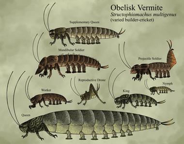 Cave Strider: A strange and elusive member of the strider group, this diminutive species inhabits the stony bowels that lacerate the corpse-isle's underbelly, although it is not truly subterranean, because it will forage in the light-touched sinkholes and crevasses periodically, before disappearing back into the dark tunnels and caverns. Their body pigmentation is mostly dark in order to blend in with the darkness, but they are still able to communicate with one another using bioluminescent markings. Red patches of bioluminescent light on its arms are invisible to many other cave-dwellers, allowing for relatively safe communication, while patches of bright blue light normally hidden under mobile skin flaps are used to startle potential predators. Cave striders use flashing patterns and specific movements of their arms to communicate messages without making any sounds that might alert hearing-sensitive predators. Because populations are widely scattered, cave striders are protogynous hermaphrodites; they are born female and the largest member of a group will become the male, secreting pheromones which prevent the other members from transitioning until he dies, ensuring no competition. Birth rate is slow, but within the bowels of the rotting acropolis there are relatively few predators to worry about; the primary exception being the bizarre xin, which frequently preys upon the squat cave striders.