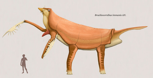 Star Strider: A violent and territorial inhabitant of the lowland prairies and savannah, these xenotherians have converted their whole bodies into powerful battering weapons, with reinforced hides covered in large chitinous scales and studded with hardened spiny knobs. In territorial disputes, males will swing themselves at one another in ferocious confrontations that will almost inevitably leave both bruised and battered. Females are more nomadic and social, but are just as battle-hungry; females will maintain a pecking order through combat and will determine the fitness of a male by having him fight the herd's matriarch before deciding whether he would be a worthwhile sperm donor. Both sexes will also vigorously defend themselves from predators by swinging their armoured bodies at full force. Although this may be rather ridiculous-looking from a distance, getting hit by a star strider is no laughing matter, with a force strong enough to rip through flesh, shatter bones, and send a man flying. The striders themselves are reinforced with thickened hides, a cushioning layer of subdermal fatty tissue, and plates of rib-like bones to protect their internal organs from serious damage, so that battles between competing striders rarely cause more than minor injuries. They are able to inflate air sacs in their upper body and raise their spines as an intimidation display, but they have been know to mistake human arm movements for an intimidation display and attack the perceived challenger.