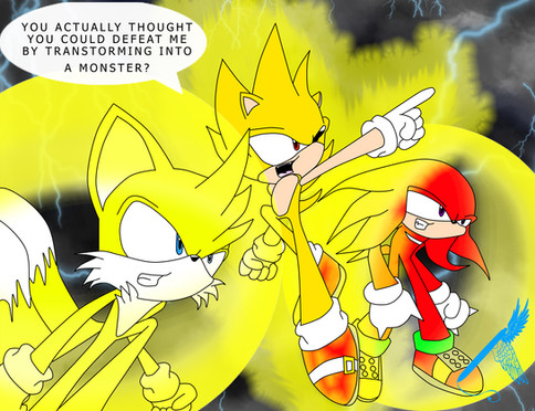 *puts on glasses* Sonic, Fleetway is an insane version of your Super Form, that will stop at nothing to kill anyone he sees, even Tails. Your eyes go all swirly, you grow sharp fangs, you grow claws and you turn into a maniac. Fleetway comes out whenever you transform using the Chaos Emerald's NEGATIVE energy instead of their positive energy, and you can't control yourself nor are you able to realize what you are doing as Fleetway Super Sonic.