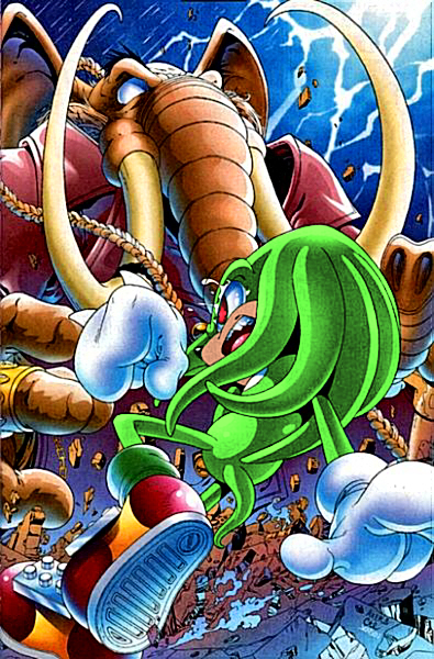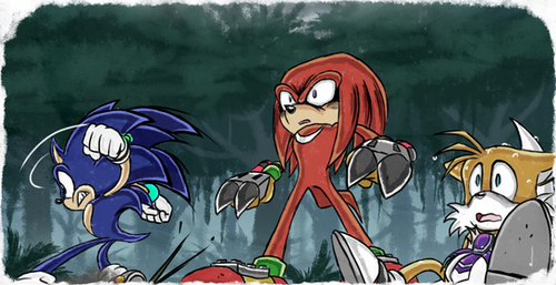 This is so incredible and fascinating! I love this scene of Knuckles fighting with a holographic Scourge! Very serious-looking! I love the blood vessel on Knuckles's head!