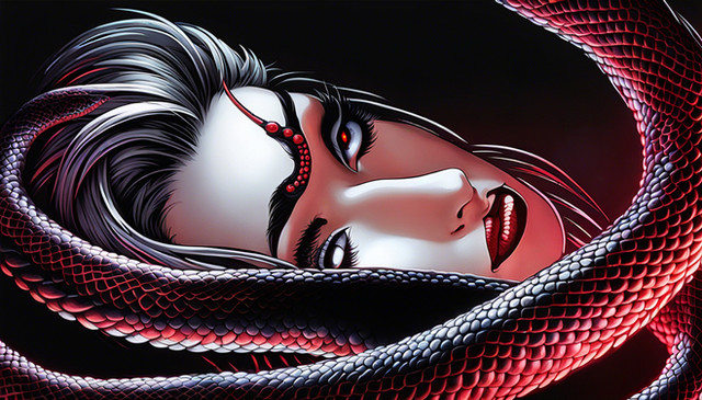 #snakebite #digitalartwork #eyes #fantasycreature #fantasygirl #humans #portraitbeauty #snakegirl #stare #charminggirl #aicommunity #midjourneyaiart