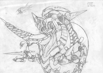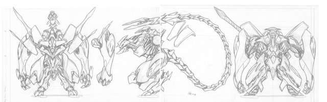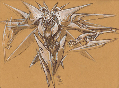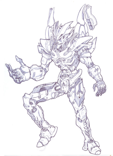 This is Novus in her favorite form; 33 feet tall, pale silver with blue and yellow highlights, and is capable of flying in robot form. Those are jets on her back. She transforms into a Cybertronian-style fighter-jet (this is her Cyber. form). She has a twin: Nefarious, who is also a Shifter like her. They are special Shifters; they can shift into anything they want (most Shifters can only take the form of something with similar mass). Despite being twins, Novus never formed on Cybertron, but formed through a human, through a process that took 100 years. Novus was born to fly, a trait from the human girl who fought in the CAF. The three symbols you see in the lower center of the paper mean this from top to bottom: