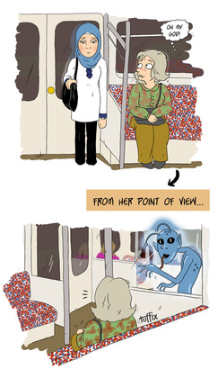 Dieses Bild hier geht ja klar um das Äußere. Und auch hier ist die Frage: Wann sehe ich "Deutsch" genug aus? Warum stört es Menschen, wenn ich ein Tuch statt einer Mütze auf dem Kopf habe? Wie ist es möglich, dass ich damit mangelnden Respekt zeige? Verstehst du, was ich meine?