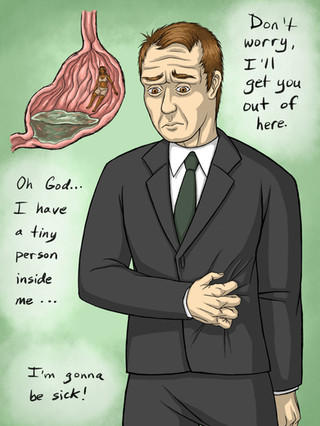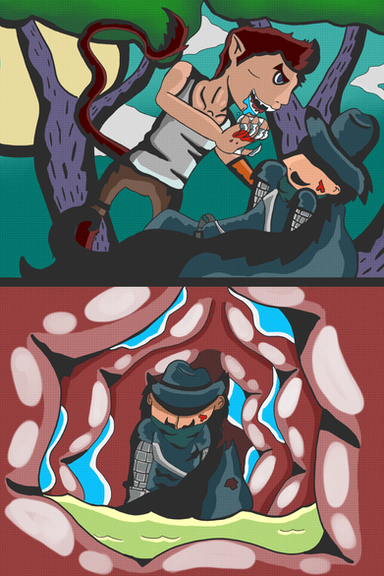 Eli is being a bit of a jerk while offering Warren lessons on how to survive giant attacks. Warren does not appreciate being eaten again.Illustration for my story found here: www.deviantart.com/tufted2/artβ¦