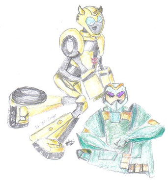 Heh, Lockdown playing with the little foldout handle bars Prowl's got theere.Got the idea from my toys.. I've actually got the both of them! So I get to pose them all fun with eachother.. The ninja bot's sitting in Lockdown's lap right now, over on my shelf. >D