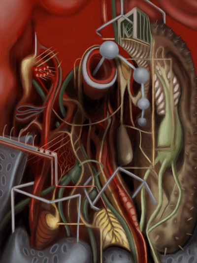Can you tell me a little bit about your process, how do you come to put together such a great composition. There seems to be a blend of photographs with your imaginative ideas about the body and they flow and intermingle throught the piece. I bet you were a big fan of the magic school bus..