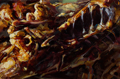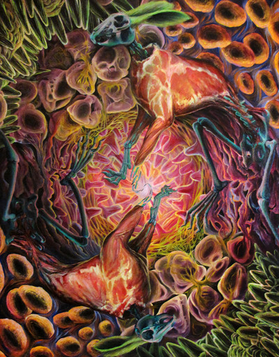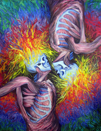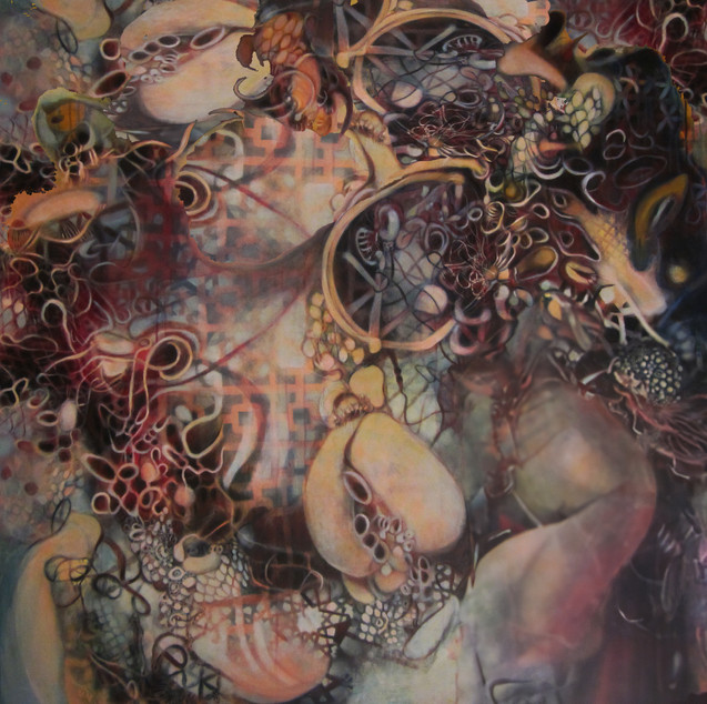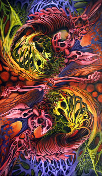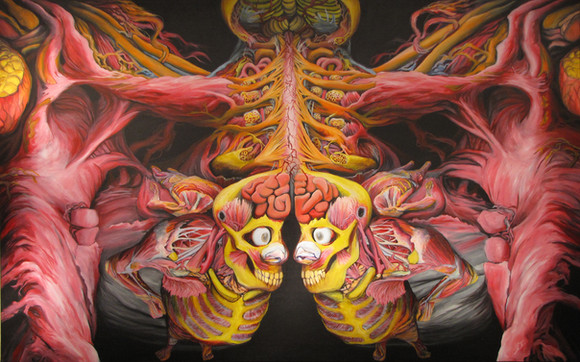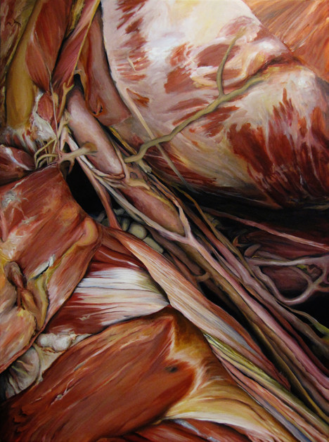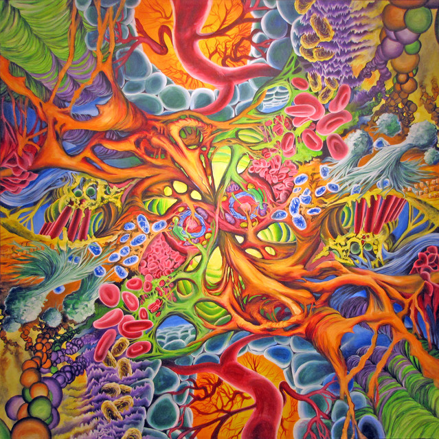 ha ha! I've never gotten that before, the quip about magic school bus, I've watched it but I rely more on actual anatomical photos and books than pop culture influences. The compositions are coming from looking at a bunch of art and some sketches i was making for this series. Most all of art relies upon some formal principles of art and recognizable characteristics that pop up again and again. This painting is from my imagination and impulse, the others are from selective editing of photos in anatomy texts. Its a very simplistic process, and your right I paint this stuff because I often find deeper insights are inherent in this material