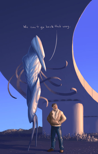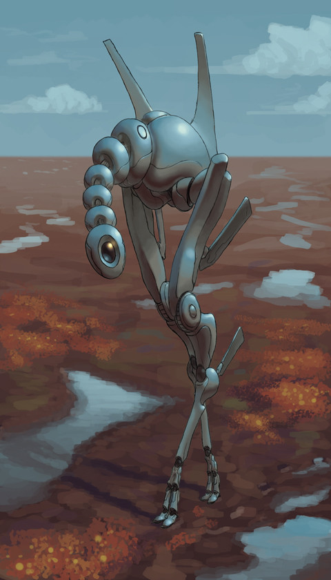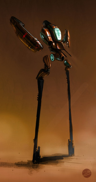 Same goes for the legs...I wouldn't go so far as to compare them to my ([link] ), but they *do* resemble the Metal Gear Ray, which I suspect was probably an influence on both of us. And in this case far more unsettling for the way the being is balanced fully upright on two ballet-pointe legs, without the addition of a supporting tail or additional appendages. (Would multiped aliens find us unsettling for the same reason??)