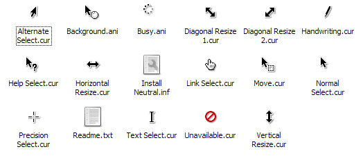A cursor set made by me using RealWorld Cursor Editor.The "Working", "Busy" and "Link" cursors are animated.