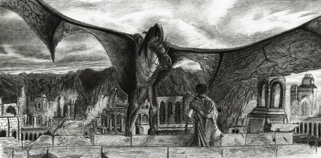 Master Mohan, this rendition sells the sheer TERROR of Ancalagon the Black even more effectively than your last rendition of him conveyed his sheer mind-numbing Scale (it occurs to me that Thorondor's thoughts on first seeing this … ENEMY take wing would have likely been more appropriate to ASoIF that to any work of Professor Tolkien!).