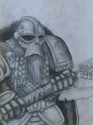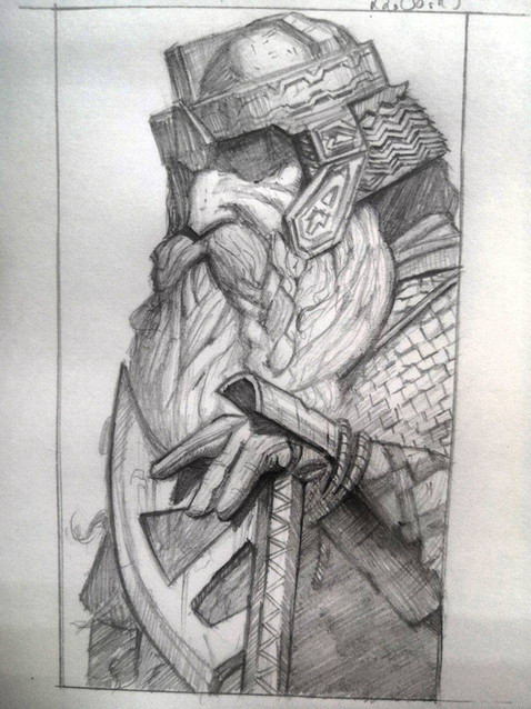 This is quite good, Turner. So fierce, so wrathful, so powerful and imposing. It's a helmet you'll only don in war and war only, it's a fearsome piece only suited for the most brutal war. You seemingly mastered the geometrical design and this one is as good as Artiga's take on the dwarves equipment. The filigree and the engraved decoration is nice, denoting his status, while keeping the "I'm-a-fucking-badass" air to it. The axe is quite good as well, althought I wonder how would you depict his long knife/dagger. Also, how is the armor covering his chest? Mail and plate? Scales? Only mail/plate?