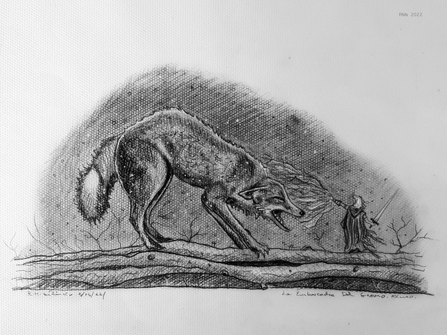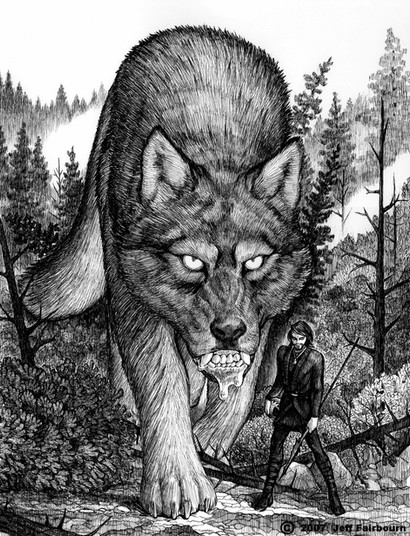The deliberate measuring gaze of the predator, evaluating its prey as it prepares to strike from coiled readiness, is unsettling. It is doubly so to the modern reader comfortably seated at home, reading about savage life and death confrontations in the wilderness. It always was a strong image, and we can only imagine the impact on the audience and artist of the pre-Industrial ages of life, when light departed with the Sun, and the wild lands at the furthest extent of the pale fence. Tolkien sure could imagine it, and he brought it back to life in all his Middle-Earth stories that involved wolves.