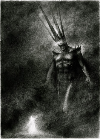 Ah, the Ancalagon of werewolves. Very nice what you've done here, simple and non-Hollywood yet very realistic, supernatural and terrifying! Those glinting eyes, the snarl and fangs and hair and claws, and the way Carcharoth is in the darkness surrounding Beren and Luthien, lurking in the shadows as they're beaten back just a couple metres by the Silmaril's light.