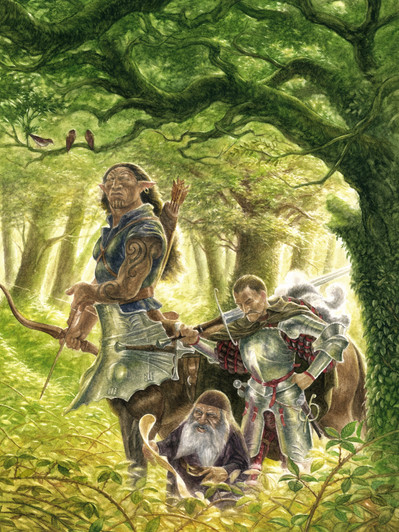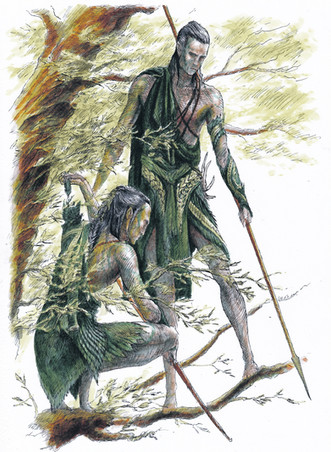 I pictured centaurs as being the "noble savages," amoung the otherwise mostly white cast of characters that populate medieval fantasy fiction, like the three pagan harpooners from Moby Dick. A big inspiration for this was Queequeg, the island prince who left home to become a whale hunter for hire and signs on to the Pequod's doomed voyage. Something about pacific islanders seems right physically for centaurs, their great size and strength, their alienness to europeans, those huge thick manes of black hair they can grow (to say nothing of those striking Ta Moko face tattoos, which i couldnt resist) also like queequeg, I liked the idea of this guy living as an outsider in a foreign land, a great warrior turned hired mercenary, with fine trappings purchased in human cities, but with his own home and people always in the back of his mind.