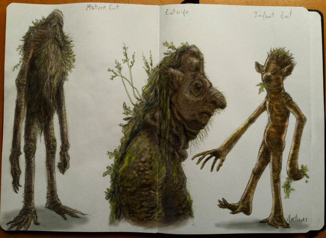 By the time we encounter them in 'the two towers,' the ents of Fangorn are the last of their species, and are for the most part old even by the measure of their kind. Their march on Isengard, in an earlier age, would have likely been a task for the young and strong among them. As it happens, it falls to the last of them still 'awake.' As Treebeard tells us, many of his people have 'gone sleepy' and no longer move or speak but stand inert deep in their forests, indistinguishable from the trees they shepherded to all but the most discerning eyes. This is likely the natural end of an ent's life, only really lamentable in that with them, one by one, go the last presence of the great giants that once roamed all the forests of the world, soon to dwindle forever into the scattered, confused legends of men.It's difficult to conceive of a consistent physiology for ents since, as Pippin observes, they vary widely from one another in appearance - much more so than would be expected of members of the same species - and the variety likely stems from effects of the conditions of their environments on their physical bodies over the course of their long, long lives. I can picture them aging quite differently from one another based - for example - on the amount of rainfall in their environments, with some, like those in green Ossiriand of old, being really mossy, their bodies and hair plastered with lichen, mosses and even mushrooms, whereas ents from a dryer, higher altitude environment like the pine forests of Dorthonion would be really straight and tall, and their skin very craggy and relatively bare of smaller plant/fungal growth. My thinking on their skin (seen more clearly on the figure on the left) is that, as with many animals (including us) the skin on their torsos, particularly in high motion joint areas, moves more than the skin over their limbs, and so becomes cracked and thickened into these bark like structures, while the limbs remain smoother, as Tolkien describes for Treebeard (We are never told if those basic physical descriptions we are offered for Treebeard himself - tall head, short neck, rough, bark-like torso, smoother arms - hold true for the others or not, but it seems likely to me that ents come into the world looking not so different from each other) The one on the right has become covered in forest growth; I imagine he'd live in a wetter, temperate rainforest environment, the craggy skin on his torso (and of course his hair and beard as well) providing more opportunities for things like moss or fungi to "catch" and grow on him until he appears roughly clothed in the stuff. Branches get tangled in their hair overtime, becoming meshed into their matted locks until they finally rot (entish hair would probably end up as a plant nursery, especially in wetter environments) I also kind of like the idea that many older ents would grow to be slightly asymmetrical, the result of standing in one place for a long time on uneven ground or in uneven sunlight, their bodies responding like trees to their conditions over long periods of inertia.