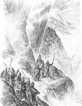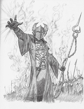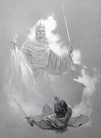 an attempt at the famous 5th century wizard, he appears floating before the welsh britons, for whom I wanted a very old time celtic look, ala Alan Lee's illustrations for the Mabinogion.Related content