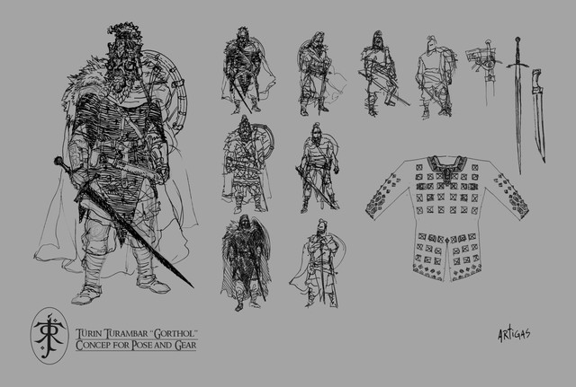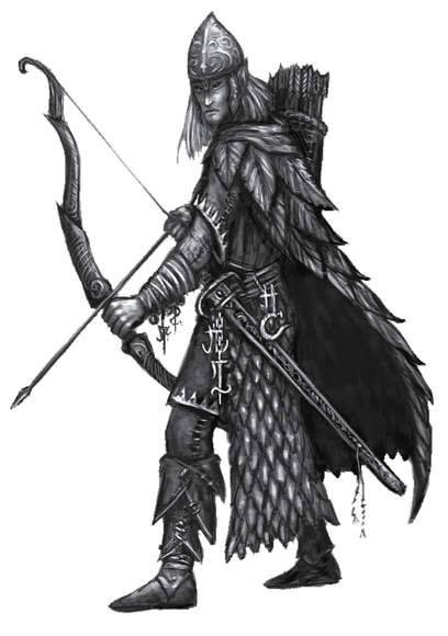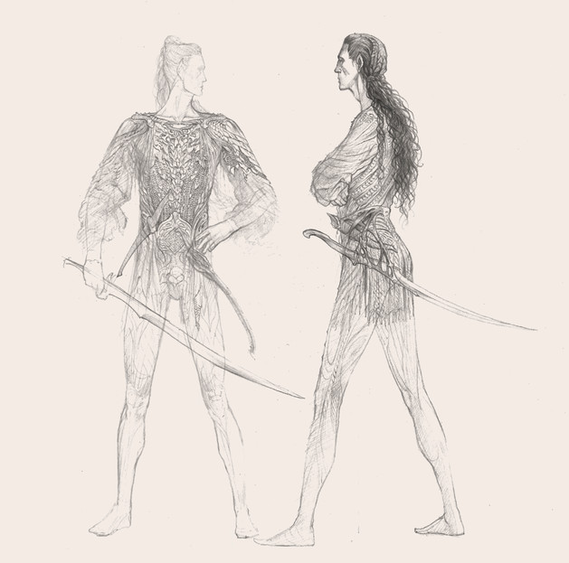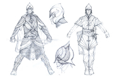 A few sketches of thingol's border wards in armor and a digital concept (still unfinished but it's been sitting in the WIP file for too long) of a hunter in doriath, it could be Beleg.The Sindar are a midpoint in terms of cultural "loft" (a somewhat frought idea when considering historic human cultures, unfashionable today but not entirely unfair I think, and for Tolkien's elves never really tied so much to technological or economic advancement as to spiritual advancement) between the lower "dark elves" of middle-earth - the Nandor in Ossiriand and the various tribes of Avarin elves throughout the world - and the returning Noldor. My mental image of the dark elves (and the few drawings it has spawned) tend to veer toward a general picture of pre-Christian, pagan "faerie" with aesthetic influences from many different "tribal" human cultures, while the Noldor (insofar as elven cultures may be compared to the stages of human culture, which I think they only can partly) draw more from what, in the broadest and most pan-worldian sense of the terms, you might call the "ancient-antique-medieval" cultural stage, ranging from the weird splendor of bronze-age Egypt or then-emerging Greece, to the gothic stone spires and keen steel swords of medieval europe/middle-east/east asia (and in many respects far beyond, though not in the "glory of science" way that has characterized human development since the early modern era) the sindar, having a foot in both worlds, I imagine as generally antique more than medieval, with much of the "faerie" aspect of the lower dark elves; the connection to and understanding of the natural world that is not really comparable to humanity in any stage of culture. This would be something the noldor are not lacking in either, they are likely just possessed of a greater overview and therefore better at interfacing with people - like men or dwarves - who don't have that faerie connection. The sindar are in this respect too a people in between, they dont have the great intercultural bond that the noldor in the north foster with the young race of men, or that comes about later between celebrimbor's people and the dwarves in eregion, but they do have their own exchanges with dwarves (predating those of the noldor) and are able to benefit from a sharing with a people of entirely different sensibilities, metalurgists and builders of stone fortresses. They (and the noldor moreso) can forgive and put in context the clumsy, heavy foot with which dwarves and men tread over ferns and hack down trees for their industry and their ever-ballooning population, respectively. And, as with the historic blending of real-world cultures, I imagine the sharing would make for many a strange and wondrous sight in Doriath of old; dwarven-carved stone halls for the Fairy King and his folk, long lean forest-wards balanced surely as birds on slender boughs in the yawning upper canopy, but in bright mail with tempered steel blades (besides, who ever saw that enchanting bamboo forest-fight in "crouching tiger, hidden dragon" and wasnt wowed by it?)