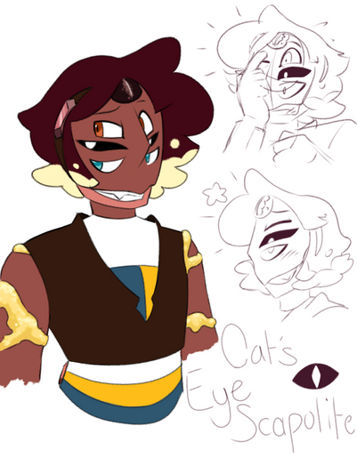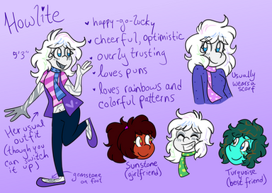 This Howlite, however, is a full Howlite, made before the process of Howlite-merging was discovered. She acts as just a smaller, more expendable Quartzite assigned to a small cluster of planets. She's a bit of a hothead; confident and impulsive. But she's a lot smarter and more thoughtful than she appears and enjoys thinking about all that stuff that would put a human into an existential crisis. (How big is the universe? What's beyond it? How many planets are there? What happens to a gem's conscious after it's shattered? Ect.)