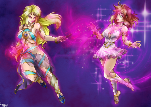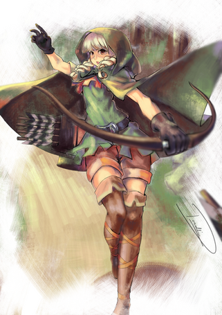 Awesome artistry! Just by looking at this picture I would have to say, "You probaly do not know much about Archery (or worse did zero research if any), But being an Archer myself I will help you by giveing pointers on the 3 things that I see wrong: 1- She must have been surprised by something because her stance is all kinds of jacked-up for shooting, 2- The bow string is on the wrong side of her left forearm (like this she would have to pull the string around her back just to fire without getting some serious string-slap), 3- She might want to turn her hand around, aiming with the thumb pointing twords the sky makes a tremoundious differance when you aim down the arrow at the target."