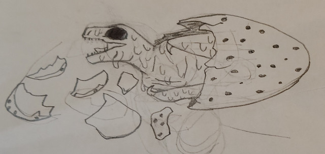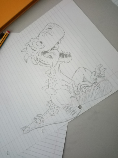 total randomness. so i see many fruits on my desk and decide to draw the pear. then i decide to draw a dinosaur for who knows what reason while thinking of life science at the same time. what was i doing anyways? when was i doing it? the world will never know.yes yes the dinosaur is not actually going to eat the pear because obviously as you can tell from its teeth, its a carnivore.