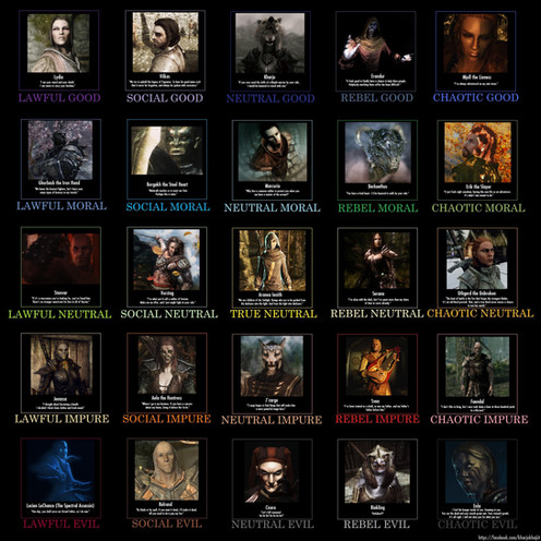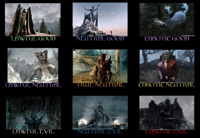 My only critique would be that Tullius and Ulfric strike me more as neutral, and the Greybeards (like Paarthurnax) as good, but the rest makes a lot of sense